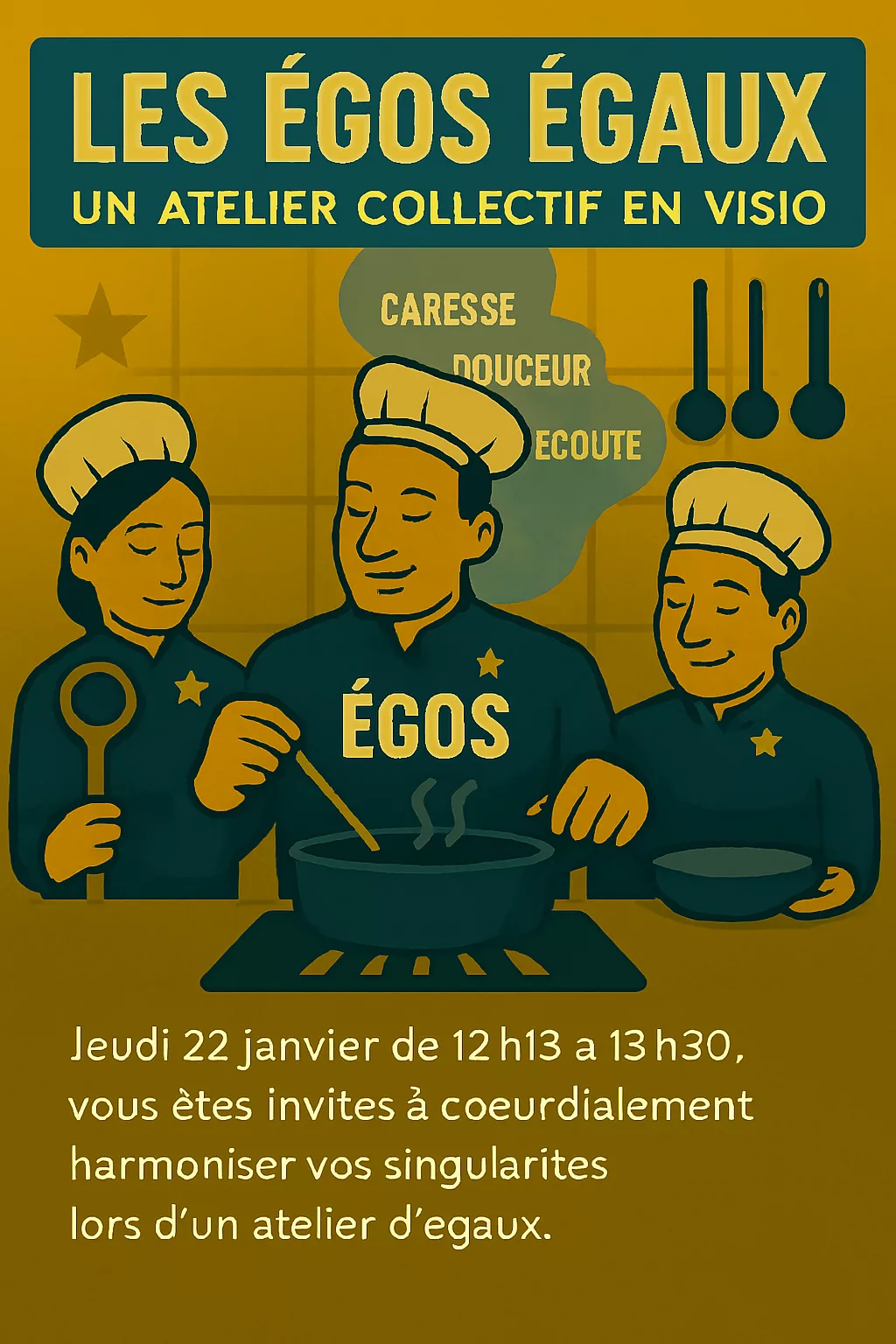 Dans cet atelier exploratoire et ludique, tu pourras expérimenter cette cuisine des egos des participants qui seront avec toi, pour sentir ce que cela leur fait de se sentir égaux et en sécurité